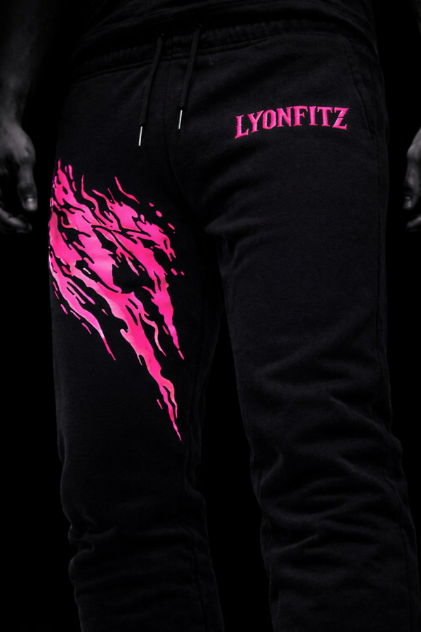 La sudadera integra gráficos agresivos en rosa neón con detalles de alto contraste sobre base negra profunda, mientras el jogger mantiene la misma línea visual con diseño lateral y tipografía LyonFitz.